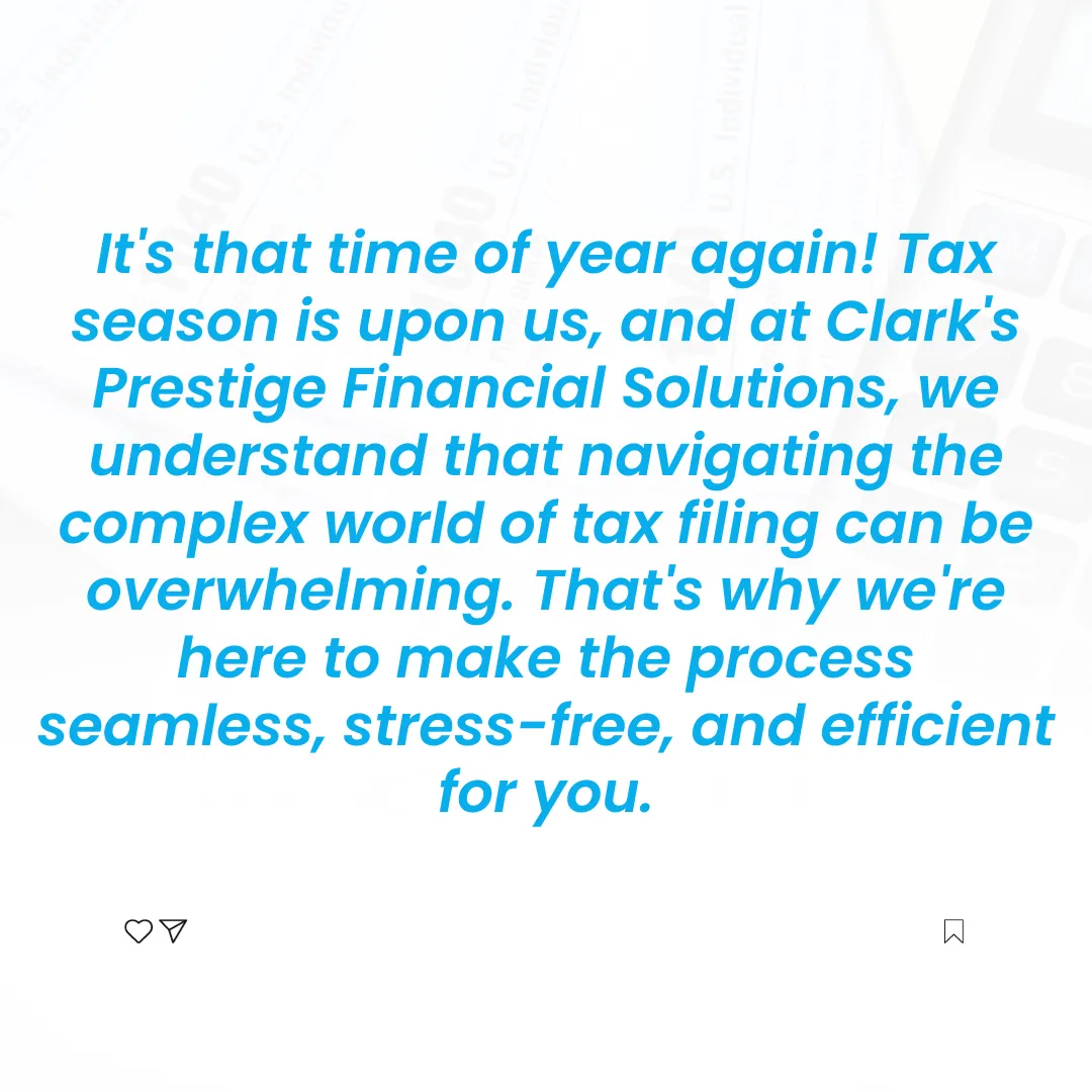 It's that time of year again! Tax season is upon us, and at Clark's Prestige Financial Solutions, we understand that navigating the complex world of tax filing can be overwhelming. That's why we're here to make the process seamless, stress-free, and efficient for you.